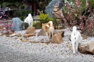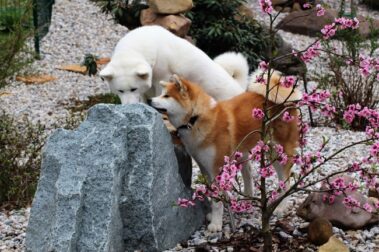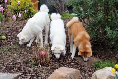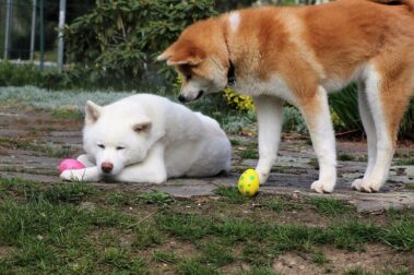 Unsere Akitas beim Ostereier suchen auf unseren Grundstück.